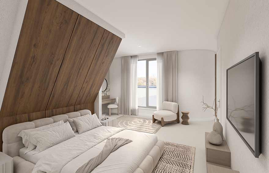 De Vijverwoning is allesbehalve doorsnee: ook op de verdiepingen voegen de kamers zich naar de bijzondere vorm van deze speciale woning. Kijk alleen al naar de 2e verdieping. Deze laat zich perfect indelen als luxe slaapvertrek met inloopkast, eigen badkamer én spectaculair uitzicht op Nieuw Kralingen. Hier kun je alleen maar van dromen.